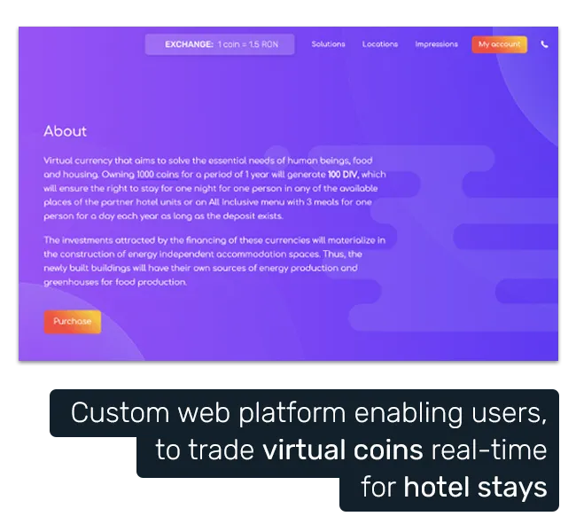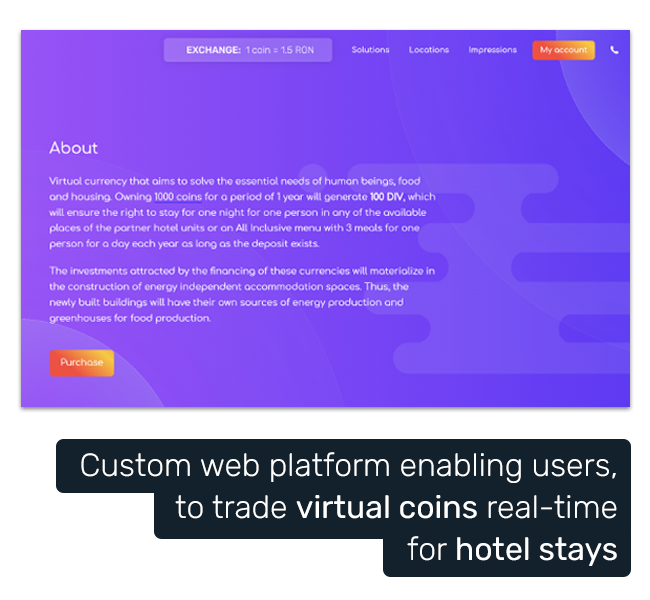 As a high-level business requirement, we had to build a trading platform where users were able to purchase or sell a custom virtual currency and secure hotel stays across partner properties. Owning a minimum of 1000 coins that are being kept for 1 year as a deposit, would give the owner the right to stay at any of the enrolled hotel units.
